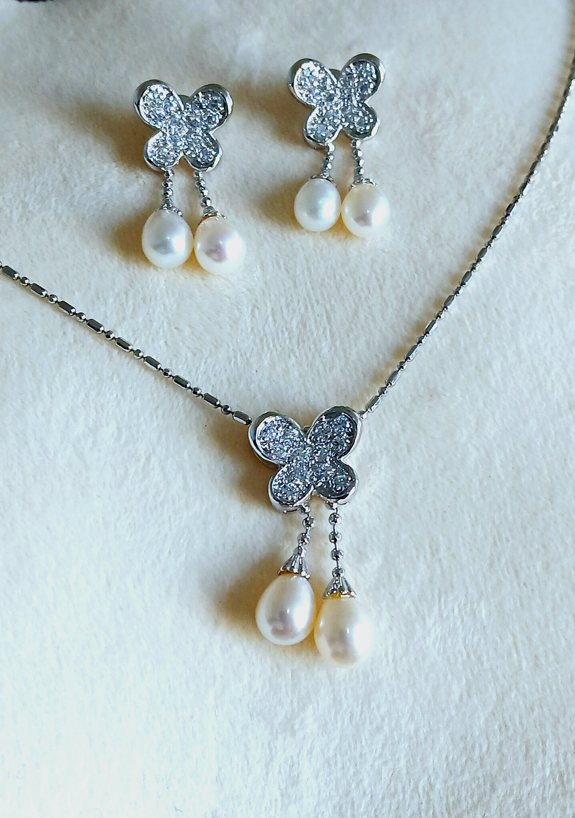 Dangling pearls and Cubic zirconia in 925 precious silver. Floral earrings and pendant set